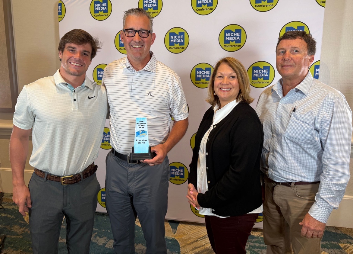 ELEVATOR WORLD President and CEO T. Bruce MacKinnon announced EW won the 2026 Nichee Award at the Niche Media Conference on April 8-10 in Orlando, Florida, for Best Business-to-Business (B2B) Magazine of the Year. MacKinnon said he is incredibly proud of the EW team and is grateful to have shared the experience with EW Executive Editor Angie C. Baldwin, Education Sales Executive Eli MacKinnon and Vice President of Operations J. Scott Eastman, who were with him in Orlando. “We are incredibly grateful for the longstanding support of our media from the elevator sector,” MacKinnon said. “Our mission is to highlight the events, milestones, remarkable projects and talented individuals in this industry worldwide. While we take great pride in being the oldest and longest-running (elevator industry) publication, our success is the result of our dedicated team and the invaluable support from our partners, authors, associations, readers, advertisers and friends.”